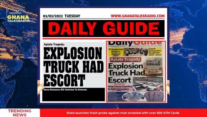 NewsGhana Newspaper [W/E-01/02/22] GTR NEWSPAPER HEADLINES: NLA GH¢55m Deal, 25 Bridges, Apiate Explosion Truck, more 1st February 2022 0 768 Share Facebook Twitter WhatsApp Linkedin Pinterest Telegram Viber Ghana Newspaper Headlines for Tuesday, 1st of February, 2022.