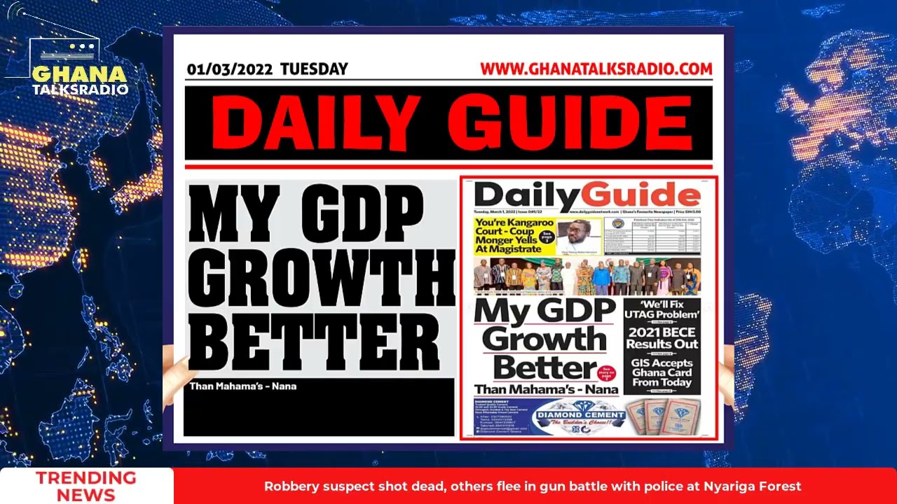 NewsGhana Newspaper [W/E-01/03/22] GTR NEWSPAPER HEADLINES: UTAG Impasse; GDP Growth; E-levy For Ghanaians; more 1st March 2022 0 660 Share Facebook Twitter WhatsApp Linkedin Pinterest Telegram Viber Ghana Newspaper Headlines for Tuesday, 1st of March, 2022.