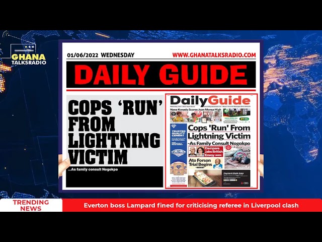 NewsGhana Newspaper [W/E-01/06/22] GTR NEWSPAPER HEADLINES: Cops ‘run’ from lightning victim, IGP scolds UK envoy, more 1st June 2022 0 622 Share Facebook Twitter WhatsApp Linkedin Pinterest Telegram Viber Ghana Newspaper Headlines for Wednesday, 1st of June, 2022.