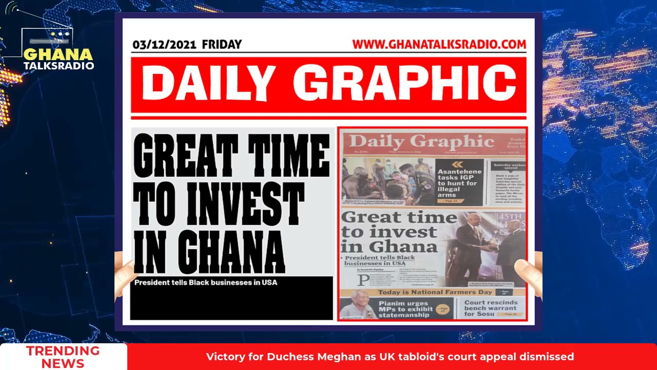 NewsGhana Newspaper [W/E-03/12/21] GTR NEWSPAPER HEADLINES: Investment In Ghana, Opunu Defence, more 3rd December 2021 0 386 Share Facebook Twitter WhatsApp Linkedin Pinterest Telegram Viber Ghana Newspaper Headlines for Friday, 3rd of December, 2021. Investment In Ghana, Opunu Defence, more