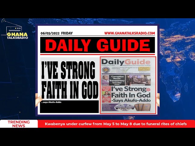 NewsGhana Newspaper [W/E-06/05/22] GTR NEWSPAPER HEADLINES: Osu Castle ammo thief jailed 3yrs; more 6th May 2022 0 391 Share Facebook Twitter WhatsApp Linkedin Pinterest Telegram Viber Ghana Newspaper Headlines for Friday, 6th of May, 2022.