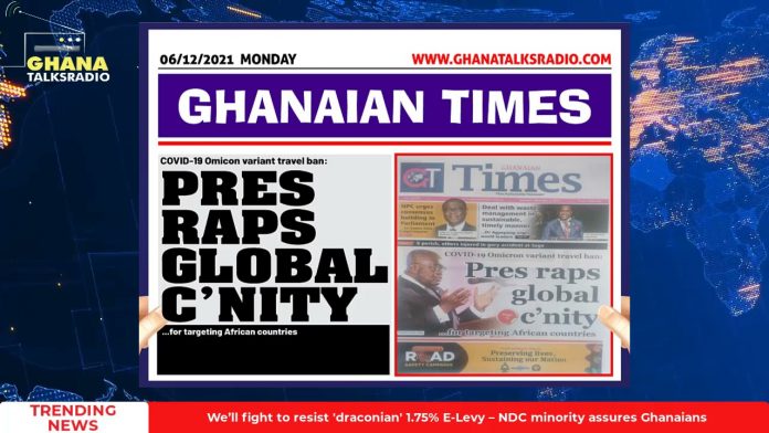 NewsGhana Newspaper [W/E-06/12/21] GTR NEWSPAPER HEADLINES: Bagbin Fears, Travel Ban, Akufo-Addo Annoyed, more 6th December 2021 0 289 Share Facebook Twitter WhatsApp Linkedin Pinterest Telegram Viber Ghana Newspaper Headlines for Monday, 6th of December, 2021. Bagbin Fears, Travel Ban, Akufo-Addo Annoyed, more