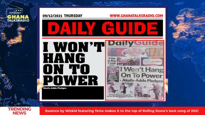 NewsGhana Newspaper [W/E-09/12/21] GTR NEWSPAPER HEADLINES: Galamsey, Violence Antidote, Power Handover, more 9th December 2021 0 386 Share Facebook Twitter WhatsApp Linkedin Pinterest Telegram Viber Ghana Newspaper Headlines for Thursday, 9th of December, 2021. Galamsey, Violence Antidote, Power Handover, more