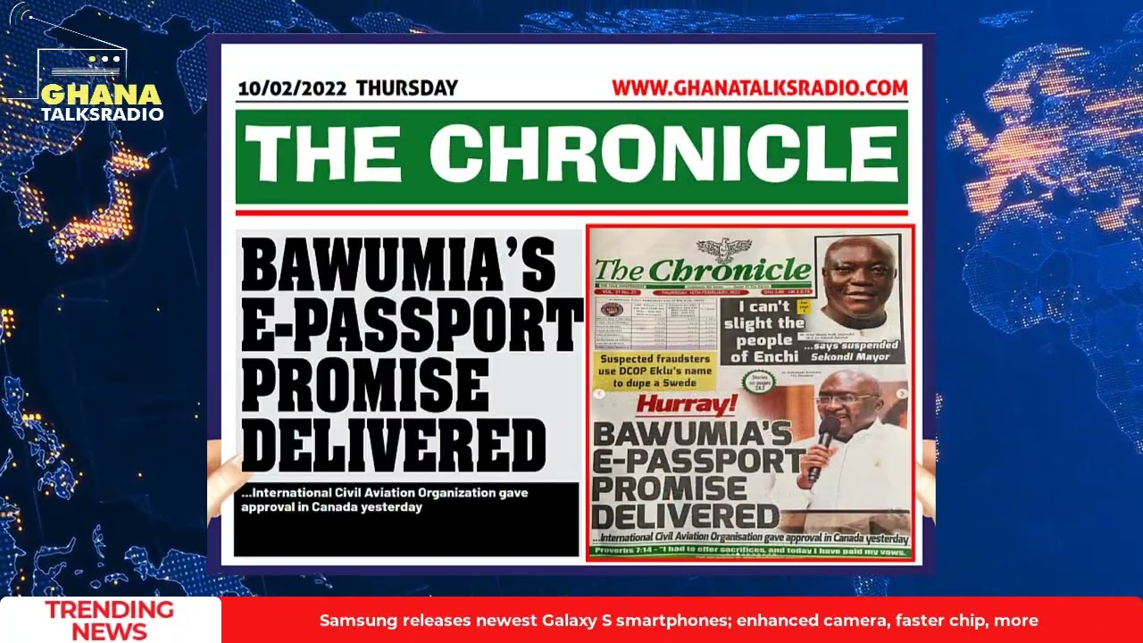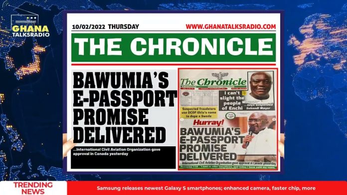 NewsGhana Newspaper [W/E-10/02/22] GTR NEWSPAPER HEADLINES: E-Passport, Students Return, Odike Vs Akufo-Addo, more 10th February 2022 0 372 Share Facebook Twitter WhatsApp Linkedin Pinterest Telegram Viber Ghana Newspaper Headlines for Thursday, 10th of February, 2022.