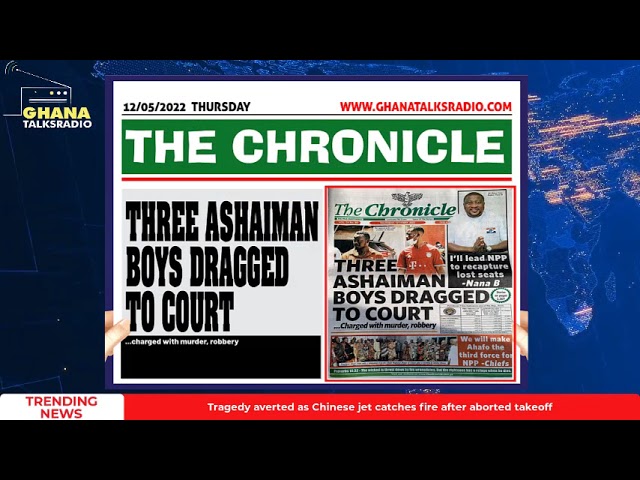 NewsGhana Newspaper [W/E-12/05/22] GTR NEWSPAPER HEADLINES: Ashaiman boys in court, Danger of smoke revealed, Codify royal lineage, more 12th May 2022 0 641 Share Facebook Twitter WhatsApp Linkedin Pinterest Telegram Viber Ghana Newspaper Headlines for Thursday, 12th of May, 2022.