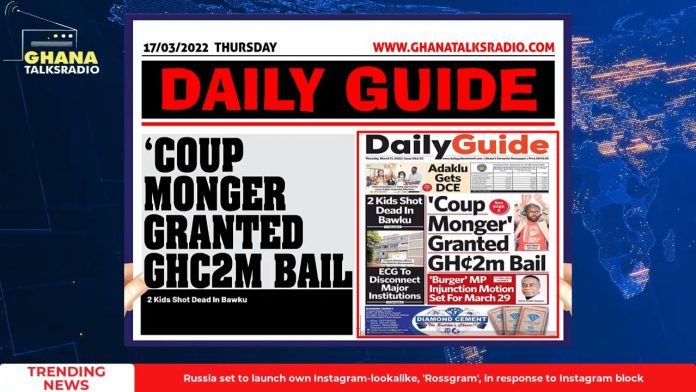 NewsGhana Newspaper [W/E-17/03/22] GTR NEWSPAPER HEADLINES: Soldiers Shot At Bankwu; 360 Transformers Installed; more 17th March 2022 0 653 Share Facebook Twitter WhatsApp Linkedin Pinterest Telegram Viber Ghana Newspaper Headlines for Thursday, 17th of March, 2022.