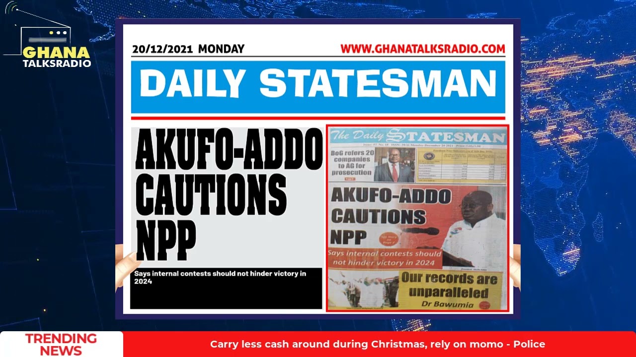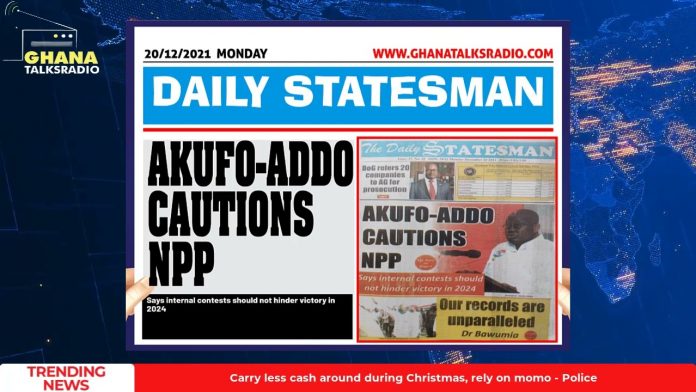 NewsGhana Newspaper [W/E-20/12/21] GTR NEWSPAPER HEADLINES: Winning 2024 Polls, ‘Die Be Die’, more 20th December 2021 0 369 Share Facebook Twitter WhatsApp Linkedin Pinterest Telegram Viber Ghana Newspaper Headlines for Monday, 20th of December, 2021. Winning 2024 Polls, ‘Die Be Die’, more
