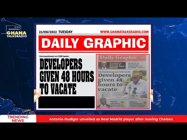 NewsGhana Newspaper [W/E-21/06/22] GTR NEWSPAPER HEADLINES: Don’t spare them at all, give deterrent punishments; more 21st June 2022 0 383 Share Facebook Twitter WhatsApp Linkedin Pinterest Telegram Viber Ghana Newspaper Headlines for Tuesday, 21st of June, 2022.