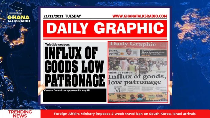 NewsGhana Newspaper [W/E-21/12/21] GTR NEWSPAPER HEADLINES: Election Flagbearer, Assassins Killed, Low Patronage, more 21st December 2021 0 491 Share Facebook Twitter WhatsApp Linkedin Pinterest Telegram Viber Ghana Newspaper Headlines for Tuesday, 21st of December, 2021. Election Flagbearer, Assassins Killed, Low Patronage, more