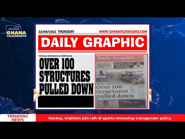 NewsGhana Newspaper [W/E-23/06/22] GTR NEWSPAPER HEADLINES: Over 100 structures pulled down; more 23rd June 2022 0 404 Share Facebook Twitter WhatsApp Linkedin Pinterest Telegram Viber Ghana Newspaper Headlines for Thursday, 23rd of June, 2022.