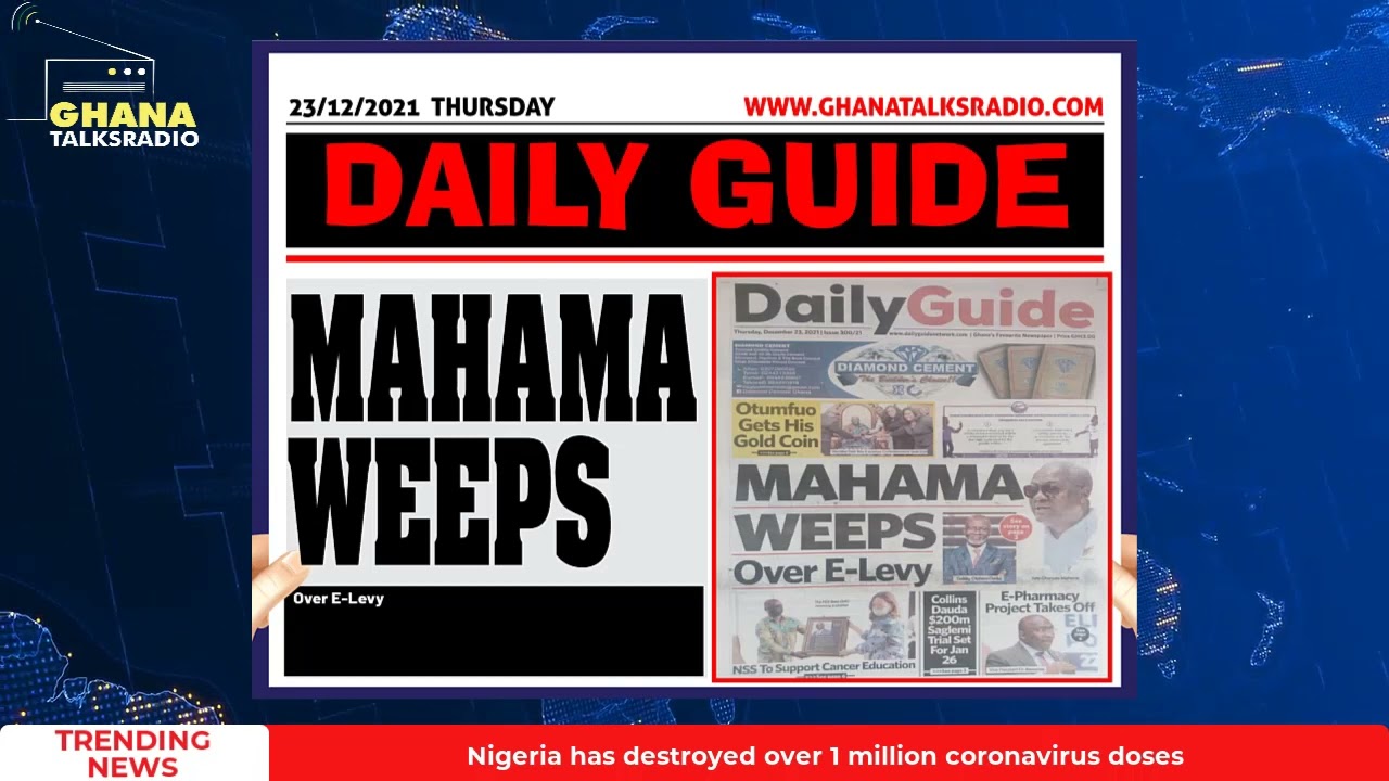 NewsGhana Newspaper [W/E-23/12/21] GTR NEWSPAPER HEADLINES: Police Radar, Christmas Suspension, Mahama Weeps, more 23rd December 2021 0 611 Share Facebook Twitter WhatsApp Linkedin Pinterest Telegram Viber Ghana Newspaper Headlines for Thursday, 23rd of December, 2021. Police Radar, Christmas Suspension, Mahama Weeps, more