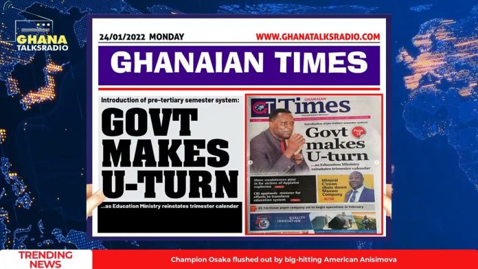 NewsGhana Newspaper [W/E-24/01/22] GTR NEWSPAPER HEADLINES: E-levy Approved, Superhero Driver, Apiate Reconstruction, more 24th January 2022 0 361 Share Facebook Twitter WhatsApp Linkedin Pinterest Telegram Viber Ghana Newspaper Headlines for Monday, 24th of January, 2022.