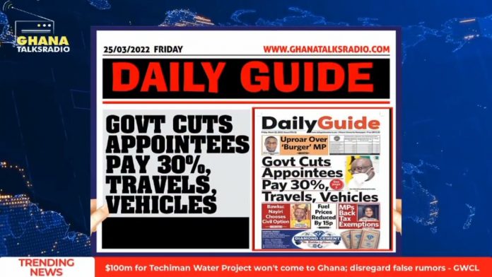 NewsGhana Newspaper [W/E-25/03/22] GTR NEWSPAPER HEADLINES: Mahama Snubs Gonjaland Youth; Govt Appointees 30% Pay-cut; more 25th March 2022 0 483 Share Facebook Twitter WhatsApp Linkedin Pinterest Telegram Viber Ghana Newspaper Headlines for Friday, 25th of March, 2022.