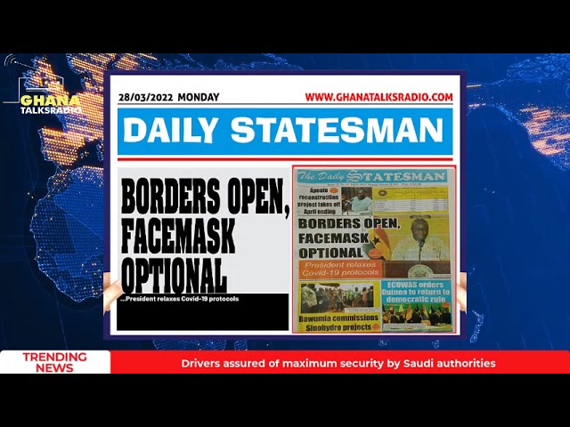 NewsGhana Newspaper [W/E-28/03/22] GTR NEWSPAPER HEADLINES: Ghana Opens Borders; Govt Rolls Out Free TVET; more 28th March 2022 0 573 Share Facebook Twitter WhatsApp Linkedin Pinterest Telegram Viber Ghana Newspaper Headlines for Monday, 28th of March, 2022.