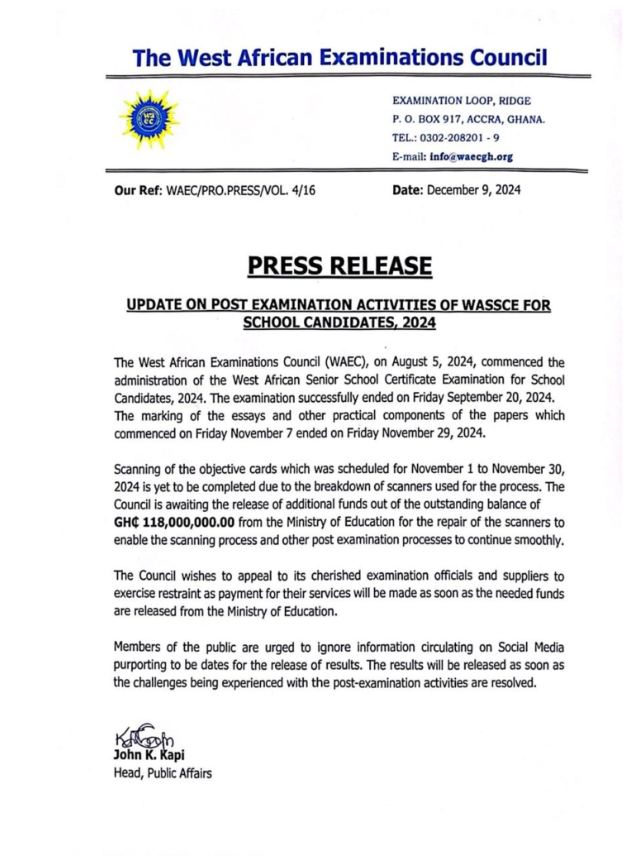 The West African Examinations Council (WAEC) has revealed that it is waiting for the release of GH¢118 million from the Ministry of Education to finalize post-West African Senior School Certificate Examination (WASSCE) activities.