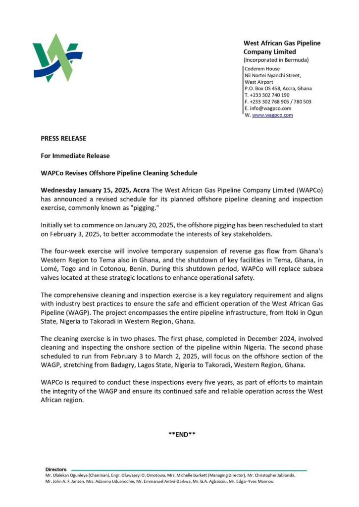 The West African Gas Pipeline Company Limited (WAPCo) has announced a new date for its planned offshore pipeline cleaning and inspection, known as “pigging.” Originally set to begin on January 20, 2025, the exercise has been rescheduled to February 3, 2025, to better accommodate key stakeholders.