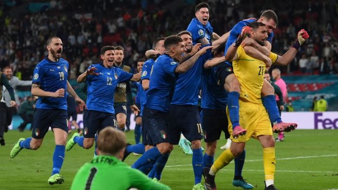 The deserved equaliser eventually came from a set-piece, with veteran defender Leonardo Bonucci tapping in after a scramble on 67 minutes and, at 34 years old, becoming the oldest goalscorer in a Euros final. He was also one of three Italians to find the net from 12 yards at the end of extra-time to seal their second Euros crown, after their first in 1968.