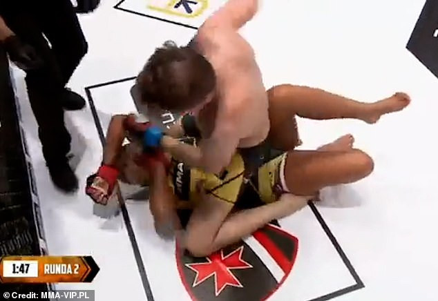 The referee for the MMA-VIP event in Poland was forced to end the bout as the woman suffered a series of blows while the crowd shouted and cheered.