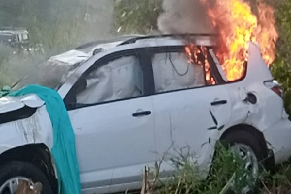 A white Toyota 4X4 has been set ablaze by an angry mob at Sefwi Afere in the Bodi district of the Western North Region after the driver reportedly bumped into three people, killing two instantly while the third, sustained severe injury.