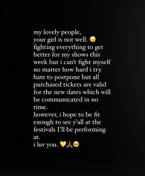Celebrated songstress, Gyakie, has announced the cancellation of all pending tours and shows in a latest social media post.