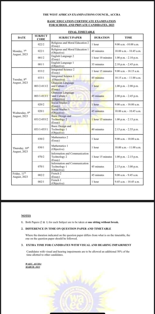 The West African Examination Council (WAEC) Ghana, has released the timetable for candidates who will be writing the Basic Education Certificate Examination (BECE) this year, 2023.