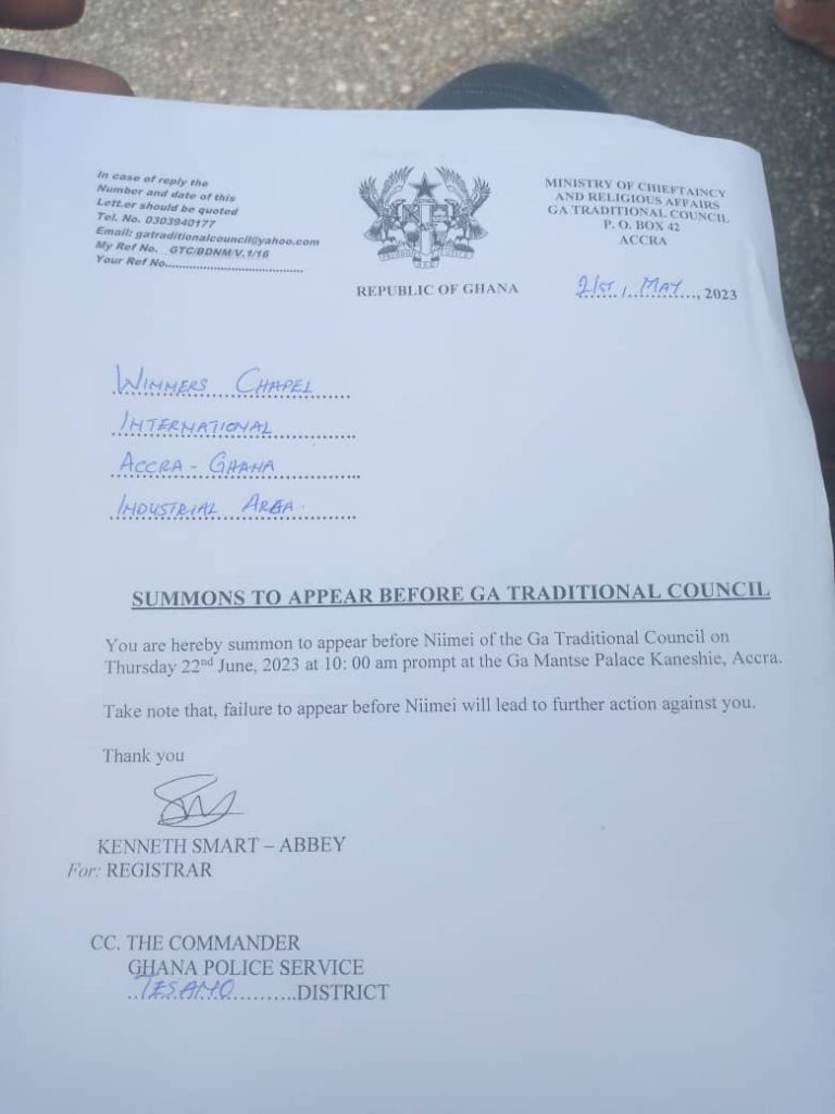 Management of the church is required to appear before Niimei of the Ga Traditional Council on Thursday, June 22, at the Ga Mantse Palace Kaneshie in Accra.