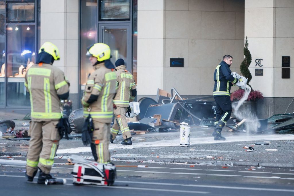 Emergency services shut a major road next to the complex that leads from Alexanderplatz toward the Brandenburg Gate in Berlin due to the large volume of water that had flooded out of the building.