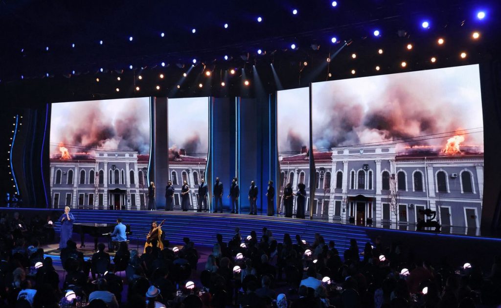 “What is more opposite to music? The silence of ruined cities and killed people,” said Zelenskiy in the video that introduced John Legend’s performance of “Free” and featured Ukrainian musicians and a reading by Ukrainian poet Lyuba Yakimchuck.