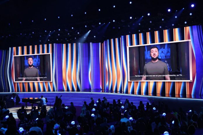 Ukrainian President Volodymyr Zelenskiy on Sunday made a surprise video appearance at the music industry’s star-studded Grammy Awards celebration in Las Vegas and appealed to viewers to support his country “in any way you can.”