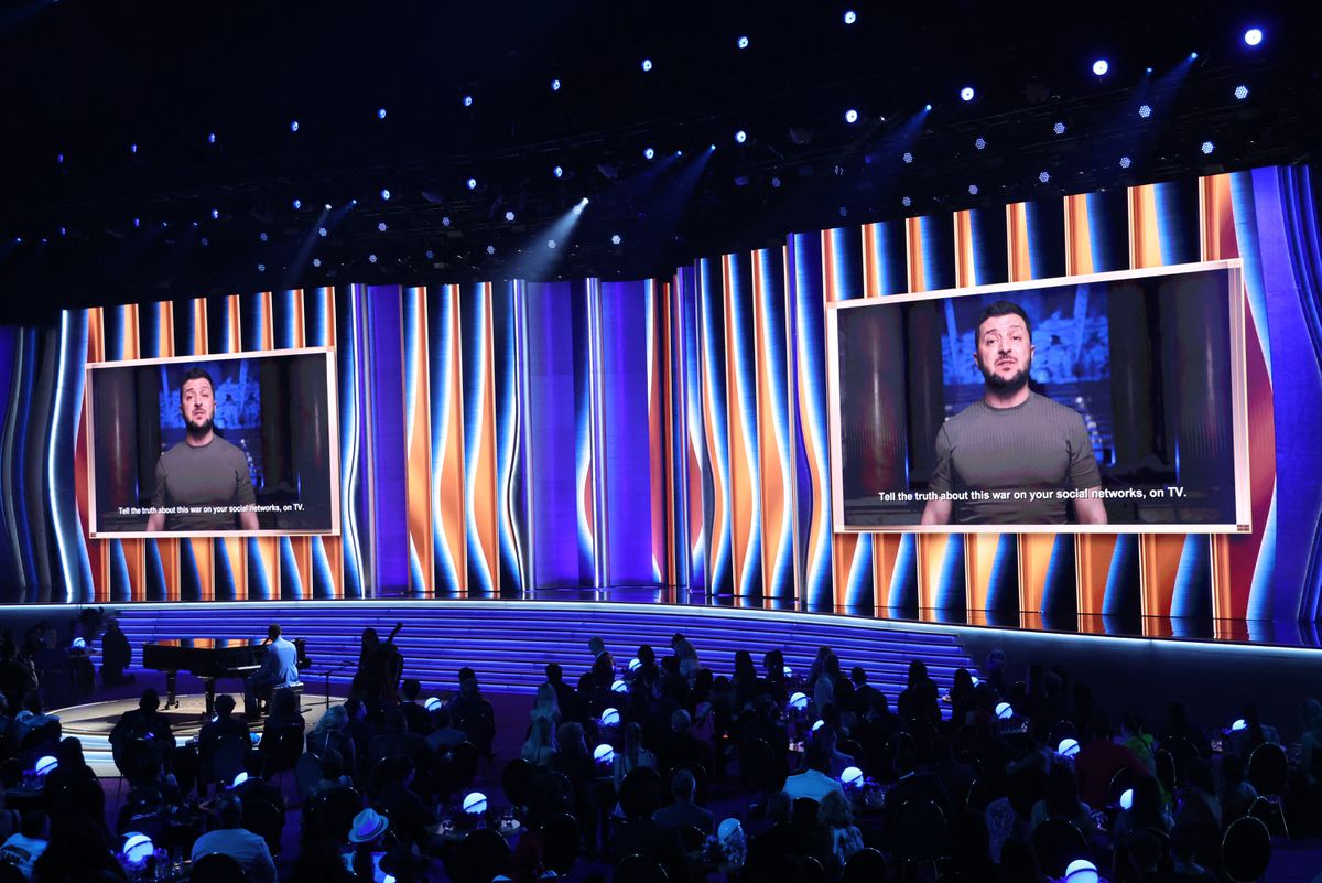 “What is more opposite to music? The silence of ruined cities and killed people,” said Zelenskiy in the video that introduced John Legend’s performance of “Free” and featured Ukrainian musicians and a reading by Ukrainian poet Lyuba Yakimchuck.