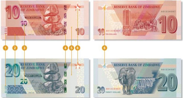 The new denominations feature a famous national rock formation and another natural wonder, the Victoria Falls, reminiscent of Zimbabwe’s original currency.