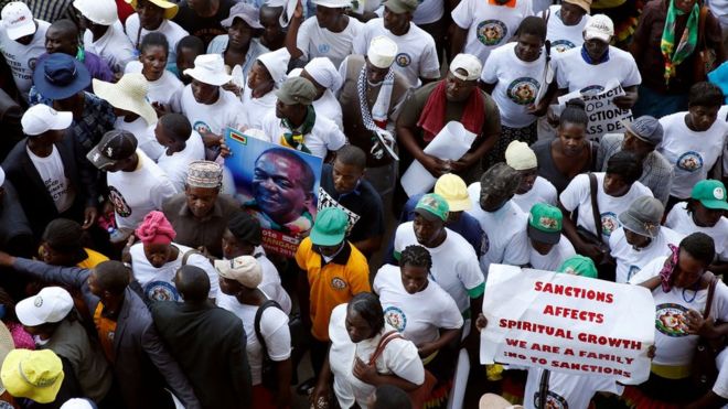 The demonstrators say the sanctions have ruined the Zimbabwean economy.